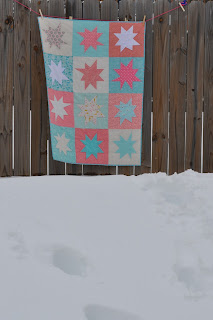 I also did simple quilting (gasp!) I just quilted around the stars with a pink variegated thread. I also did a single fold binding. I am not sure what I was thinking and used the binding fabric for another project not leaving me enough for a double fold. Then I could not find the print anywhere anymore.